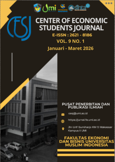 CESJ (Center of Economic Students Journal) is a scientific journal focusing on the field of economics, published periodically by students of the Faculty of Economics, Universitas Muslim Indonesia (UMI). This journal serves as an academic platform for students to enhance their scholarly capacity through the publication of original and relevant scientific works that contribute to the theoretical and practical development of economics.
